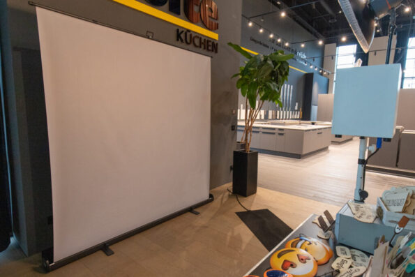 Ein Calumet X-Frame in der Größe 2,50 m x 2,50 m oder ein flexibel und platzsparendes Roll-Up System, falls das Platzangebot beschränkt ist.